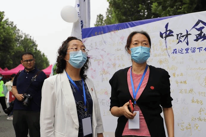 作为中财大院,金院的报道点也有许多亮点:象征着金彩金院的白金金属气球装饰着迎新棚,志愿者可以手持的青春标语KT板,新生可以寄语留念的祝福墙,以及带有学院标识的合照板,处处精心的布置彰显了学院对新生的美好期许。