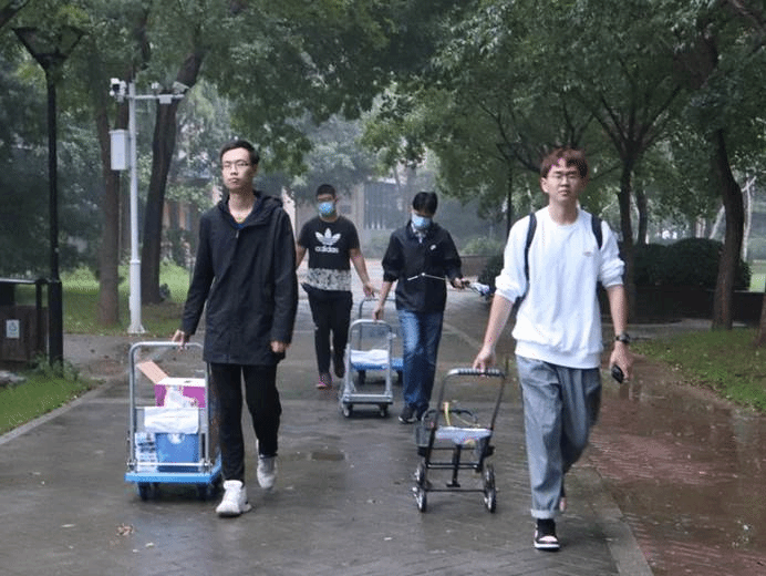 新生在完成报到手续之后,由学院事先招募的志愿者接过行李箱,引领同学前往宿舍,并帮助学生将行李搬运至宿舍楼上。尽管空气闷热,志愿者们已经汗流浃背,脸上却依旧挂着满足而温暖的笑容,时刻准备帮助下一位有需要的同学。