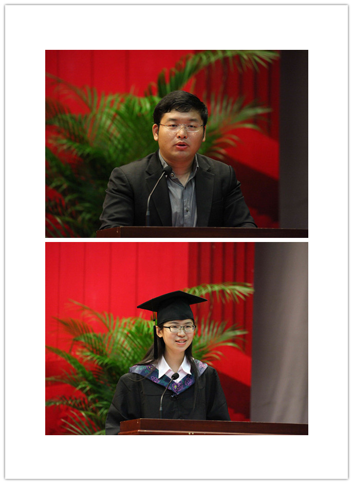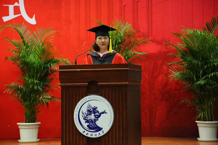 2017届毕业生代表张金慧同学代表全体毕业生发言。她回忆了在学院度过的难忘岁月和青春记忆,毕业生离开校园但财经黄埔人的初心永不变。她号召毕业生要做创新社会的中流砥柱和改变世界的中财力量,永远铭记中财学子的责任担当,带着母校、学院和老师的殷切希望,开启新的征程。