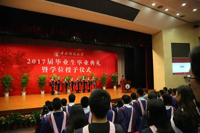 典礼在嘹亮振奋的《义勇军进行曲》中拉开了帷幕。院长助理李俊峰宣读了《关于2017届本科生毕业及授予学士学位的决定》,应展宇副院长宣读了《关于2017届硕士研究生毕业及授予学位的决定》。在激动人心的优秀毕业生表彰环节,葛仁霞书记宣读了《关于表彰2017届优秀毕业生的通知》,李建军院长和葛仁霞书记为北京市级优秀毕业生颁发了荣誉证书并合影留念,应展宇副院长、谭小芬副院长、院长助理李俊峰、院长助理黄志刚为校级优秀毕业生颁奖并合影留念。谭小芬副院长宣读了《关于表彰2017届到西部就业毕业生的通知》,金融国家级教学名师李健老师、张礼卿老师为获得表彰毕业生颁奖并合影留念,其中2017本科毕业生许来香积极响应国家号召,不畏艰苦,自愿到西藏基层工作,所有这些到西部就业的毕业生充分展现了中财金融人的社会责任担当。