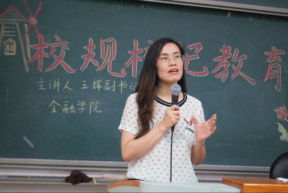 首先,王辉老师从自我评价、培养目标、学习方式、人际交往、生活方式和外部环境等六个方面的转变介绍了大学生面临的挑战,并针对存在的问题,给予了相应的解决方案。同时她提醒在座同学要关注心理健康,关注盗窃、诈骗、消防、交通等安全问题,远离邪教,远离网瘾。随后王辉老师从入学教育、日常教育、安全管理、朋辈互助、学生活动、国际视野培养、奖助学金和全方位的心理健康教育体系等方面全面介绍了开云kaiyun官网的学生工作体系和帮扶机制。接下来,王辉老师通过学院发生过的诸多违纪案例以及处罚结果全方位的讲解了我校违纪处分管理规定、学生管理规定等文件,告诫所有同学一定要严格遵守法律法规,遵守校规校纪,培养规则意识。最后王辉老师祝愿同学们能够在中财度过充实、快乐、美好的四年。
