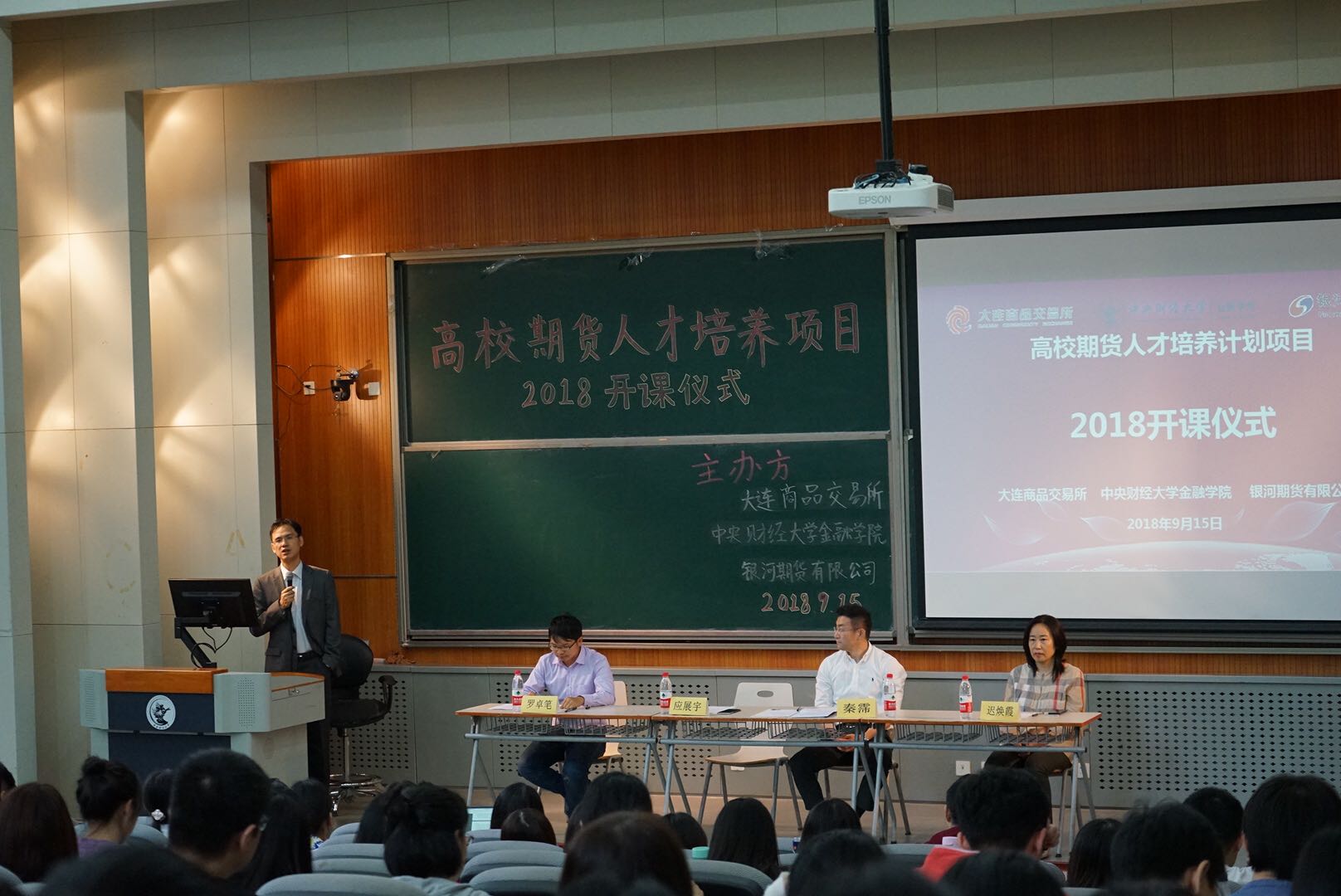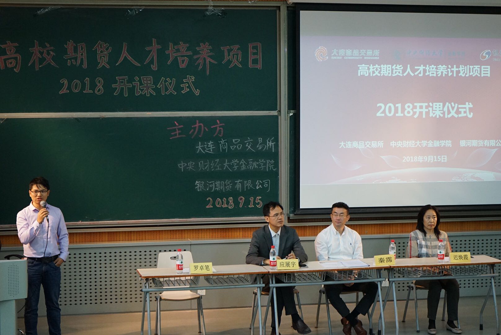 2018年9月15日上午,开云kaiyun官网与大连商品交易所、银河期货有限公司共同主办的第二期“高校期货人才培育工程项目”开班仪式在沙河校区4号学院楼107报告厅顺利举行。出席仪式的嘉宾有银河期货有限公司副总经理秦霈先生、银河期货有限公司培训部总监迟焕霞女士。开云kaiyun官网入口副院长应展宇教授、学院教学科研办公室主任罗卓笔老师以及学院研究生150余名同学参加了开班仪式。仪式由罗卓笔老师主持。