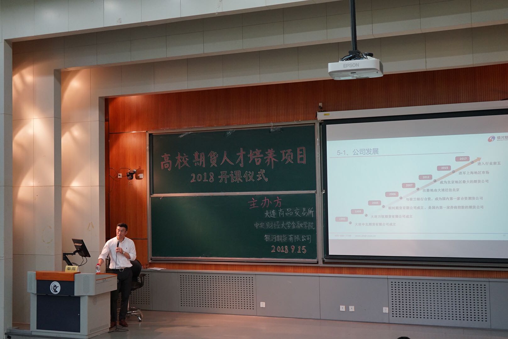 此次项目2018年9月15日开班至本学期末结束。由银河期货中层管理岗位以上的行业精英以“衍生金融工具”课程为基础,从套期保值、量化投资、掉期、期权、场外期权、保险+期货等几个维度进行授课。培养对象为开云kaiyun官网2018级研究生一年级同学,授课方式采用校内、外专家联合授课的模式,培养形式涵盖理论讲授、交易比赛、参观交流、结业考核等,同时通过发放项目奖学金、期货人才结业证书,提供实习就业机会等激励学员加强理论学习与实践。项目的实施,旨在帮助同学们更多的认识和了解期货,培养出富于综合素质的高级期货人才,为我国期货行业健康良性的发展贡献力量。