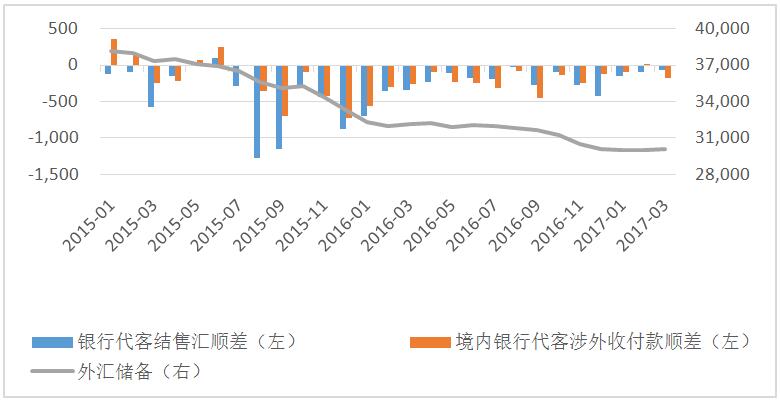 国际通行口径下跨境资本流动一般用国际收支平衡表中资本和金融项目来衡量,资金流动的最后结果表现在储备资产项目下,2015年外汇储备大规模减少,2016年下半年外汇储备连续7个月下降,2017年3月末官方外汇储备连续两个月小幅回升至3万亿美元。宽口径下资本流动一般通过结售汇和跨境收付数据来衡量,跨境收付数据主要反映企业和个人通过银行办理的对外收付款;银行代客结售汇主要反映企业和个人在实现上述跨境资金收付前后,从银行购汇或者结汇的数额。从二者数据来看,资本流出较严重的时期是2015年8.11汇改,以及2015年底的人民币汇率贬值时期,2016年银行结售汇和境内银行代客涉外收付款逆差规模明显收敛。此外,从2016年5月开始,银行代客涉外收付款差额大于银行代客结售汇差额,表明居民与非金融企业出售的外汇资产低于他们通过跨境交易获得的外汇资产,居民与非金融企业更加倾向于持有外币资产。